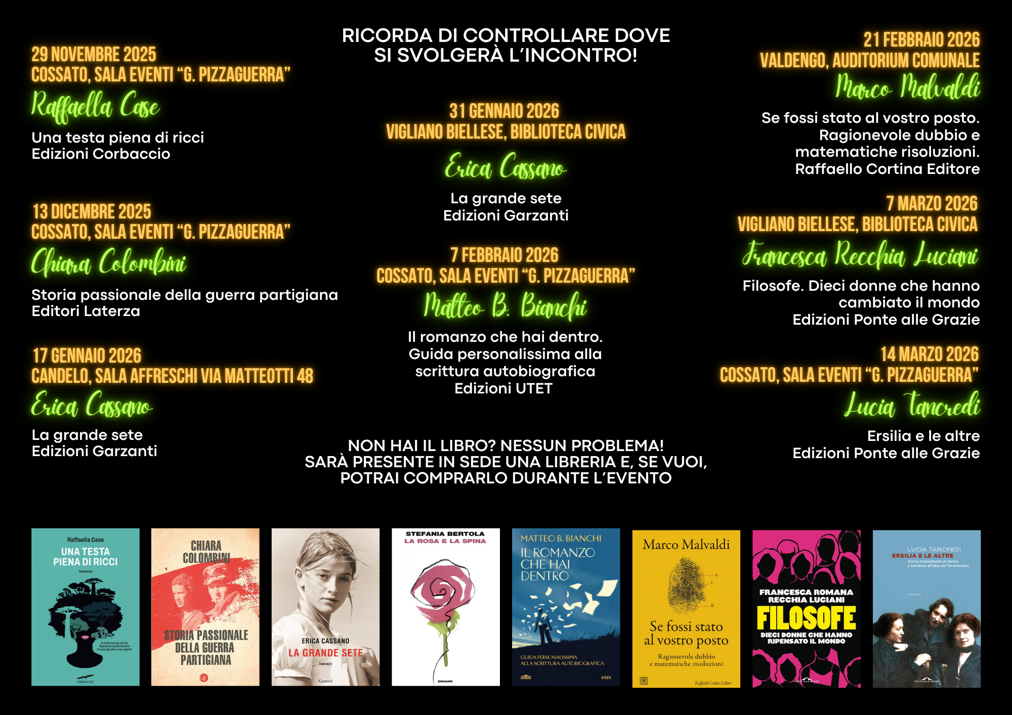 Grazie al contributo della Fondazione Cassa di Risparmio di Biella nell’ambito del Bando Eventi e alla collaborazione dei Comuni di Candelo, Cossato, Valdengo e Vigliano Biellese anche quest’anno scolastico si rinnova l’appuntamento con il progetto "Meet the writer", il ciclo di incontri con scrittrici e scrittori organizzati dalla Biblioteca del Liceo del Cossatese e Vallestrona. Di seguito le date degli incontri: